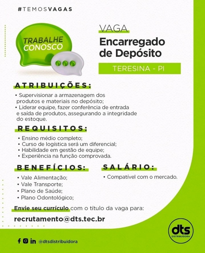 Importante: Ao enviar seu currículo informe ao recrutador que viu esta vaga no site Vagas Teresina. Nossa indicação pode aumentar suas chances de conquistar seu emprego!