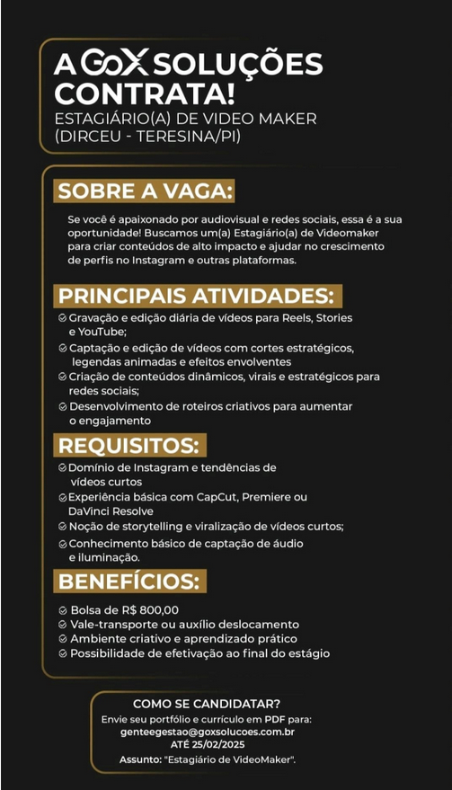 Vaga de Estagiário de Vídeo Maker em Teresina/PI